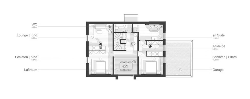 Unter der Gaube befindet sich ein Luftraum mit Galerie, der für eine hohe Wohnqualität sorgt. Das Satteldach greift die umliegende Bebauung auf und das Gebäude fügt sich so harmonisch in die Umgebung ein.