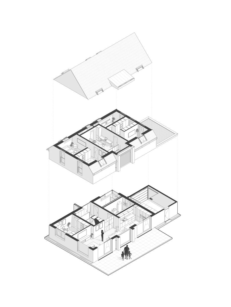 Baurechtlich befanden wir uns im unbeplantem Innenbereich und mussten uns nach §34 BauGB an der umliegenden Bebauung orientieren. Dieser Paragraph kommt zur Geltung, wenn kein Bebauungsplan existiert und besagt, dass sich das Vorhaben nach Art, Maß, Bauweise und überbauter Fläche in der konkreten Nachbarschaft einfügen muss. Dieses nachrangige Baurecht kommt zur Geltung, wenn kein Bebauungsplan existiert. Anhand dieser Vorgaben haben wir ein Einfamilienhaus mit Satteldach entworfen, das sowohl den gesetzlichen Vorgaben entspricht als auch den Wünschen der Bauherren nachkommt. Die Bauherren haben viel Wert auf Privatsphäre gelegt, daher ist das Haus zur Straße hin eher geschlossen gehalten.